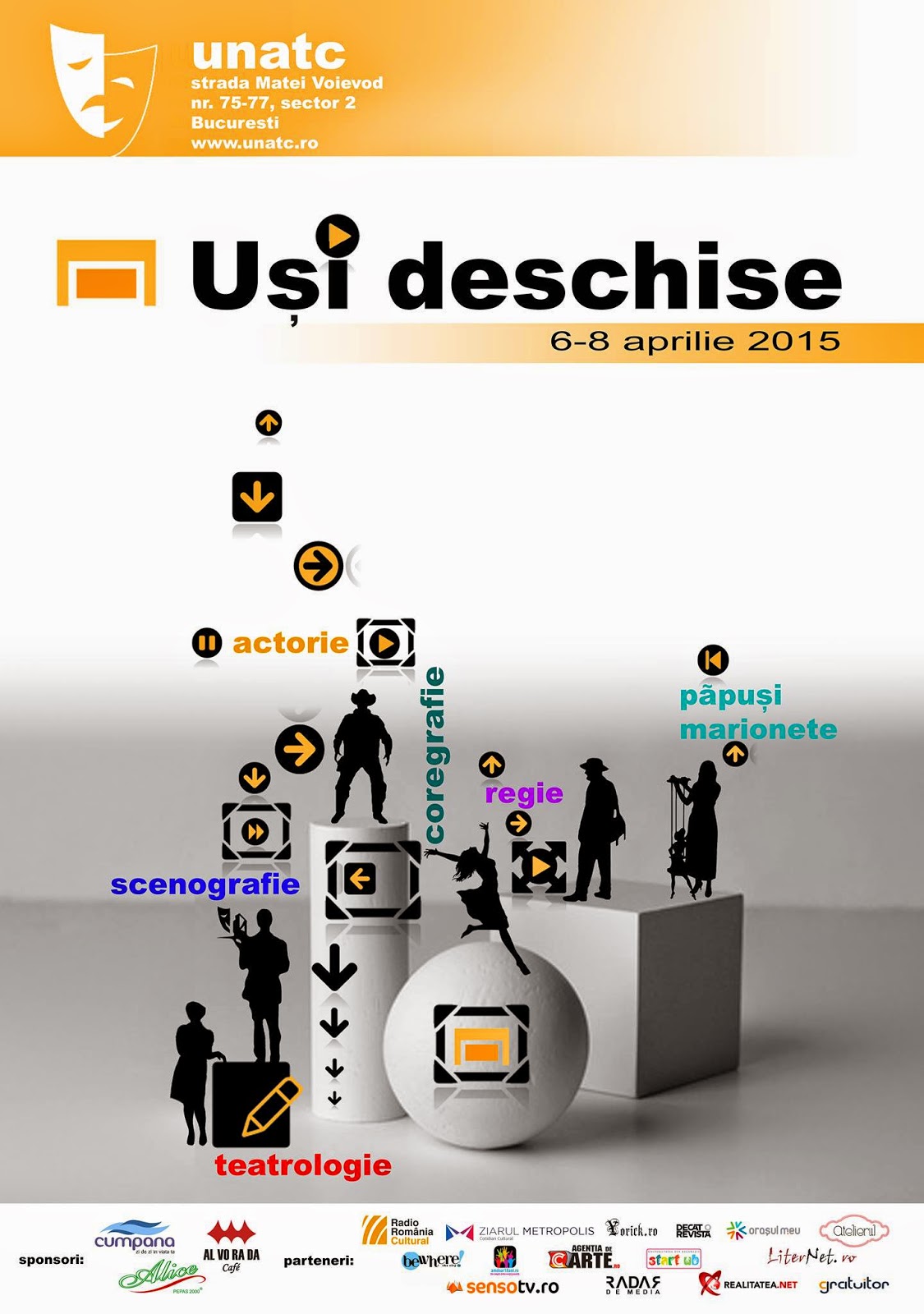 La UNATC (strada Matei Voievod nr. 75-77), in perioada 6 - 8 aprilie, are loc cea de-a XIX-a editie a programului Usi Deschise, adresata celor care sunt interesati sa urmeze o cariera artistica in teatru sau media.